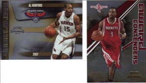 From the Panini Playoff Contenders 09-10 set we have two inserts.  To your left, is a Draft Class of Al Horford (2007), who has been pretty damn good for the Hawks, but not quite at the potential a number 3 pick should strive to achieve.  To your right is an Award Contenders Tracy McGrady.  I don’t know what player they’ve been watching recently, because I certainly wouldn’t call him a contender.  I believe you have to actually play a few games for that to be the case.
