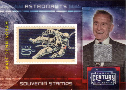 Finally, we have our astronaut card. What an awesome-looking card. If I was more into the space program, I’d want every single one of these. It reminds me of something you’d see in a space flight exhibit at a museum. Cool stamp, cool design, nice little picture and a relic… but again, we have no idea what the relic was cut from. A spacesuit? Awesome! His tie? Not awesome. There’s a discussion to be had here about the commoditization of celebrity. I mean, Mr. Cunningham is the hereo here, not his spacesuit so why should I care? But I do care. I do. There are autographed versions of these as well and they are not be-stickered like their sport counterparts, making them extra super cool.