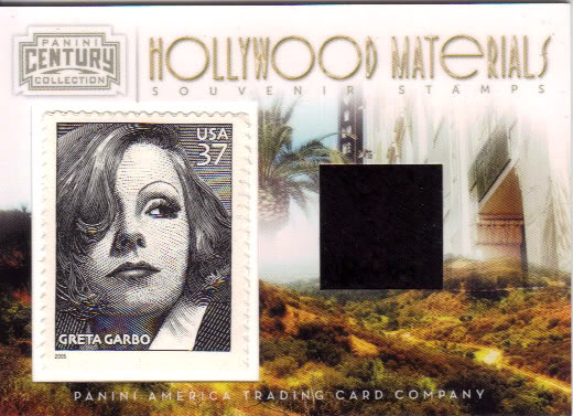 Holy Hollywood, Batman! That’s something Greta Garbo wore! Wait, what is it, exactly? Don’t know. Back of the card explains nothing about the relic. Hmm. I was prepared to be impressed by learning that she wore it in an Oscar-nominated movie or something, but there’s really no information. Very disappointing, especially considering that the article of clothing died a brutal death to make this card possible. I hope the information is somewhere. On a positive note, the design of this card makes much more sense- Hollywood studio in the background, awesome stamp featuring the star and a maybe-slightly-too-small-for-my-taste relic. This is a cool card, despite the lack of identifying information. Besides, the relic itself is a super cool silky-faux-fur number. Awesome.