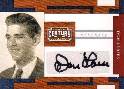 This card pretty much reinforces my previous comment. Same card, no relic. Place for a relic, but no relic. The inclusion of the “Postmark” label there makes me think that there was some serious potential for a stamp-based design for this set (there are tons of stamp cards in this set), but the blown-up microchip background doesn’t play into that at all. And, of course, Larsen’s signature is deteriorating at his age, but this guy pitched a perfect World Series game, so he gets a lifetime pass on anything he does with that magical arm. With these first two cards, you can definitely not complain about the checklist. These two are heavy-hitters that any baseball fan would be glad to pull (except maybe Dodger fans on the last one here). This auto is numbered to 38 because… they had 38 auto’d sticker left? Not sure. Panini’s usually good about having square or reasoned numbering to their hits and inserts, so I’m not sure why they went with a non-significant number here.